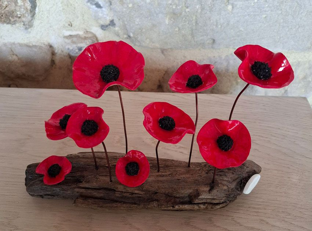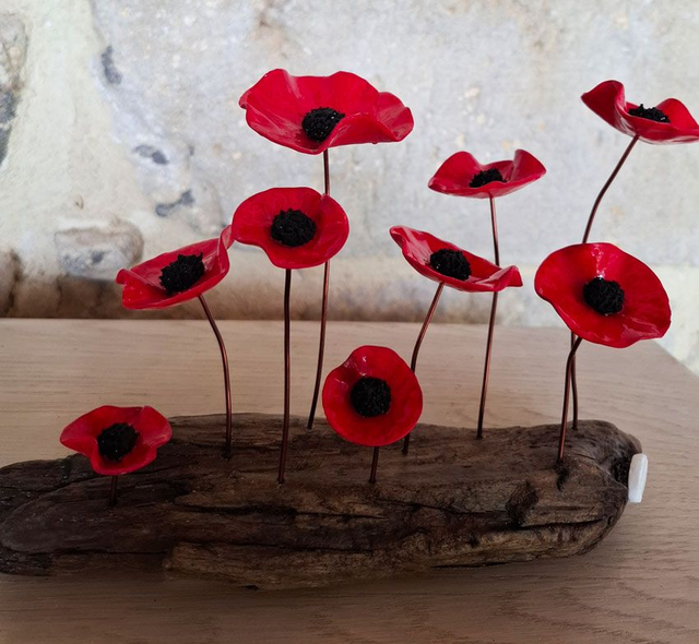 Coquelicot sur bois flotté L 35cm H 25cm P 12cm